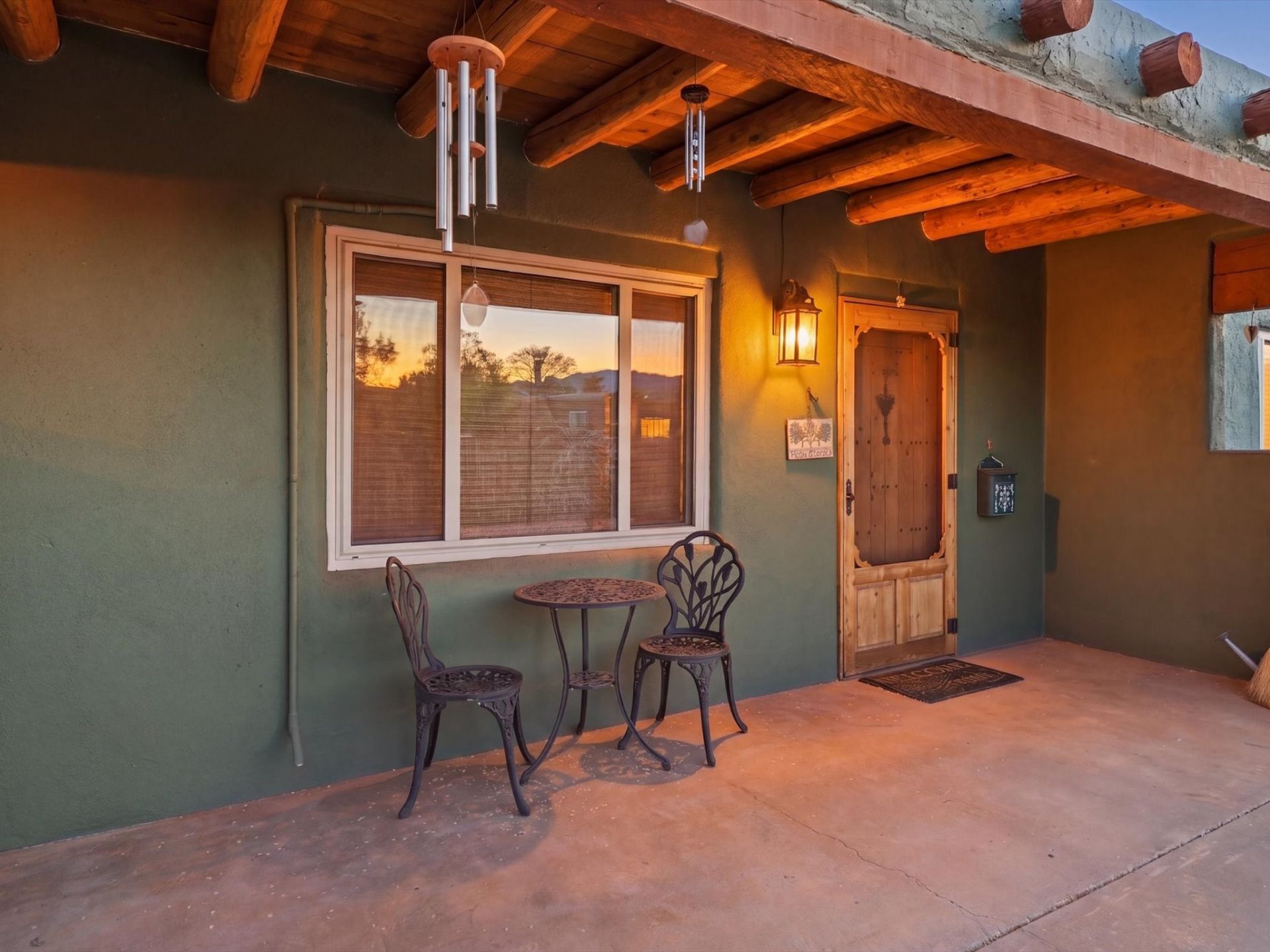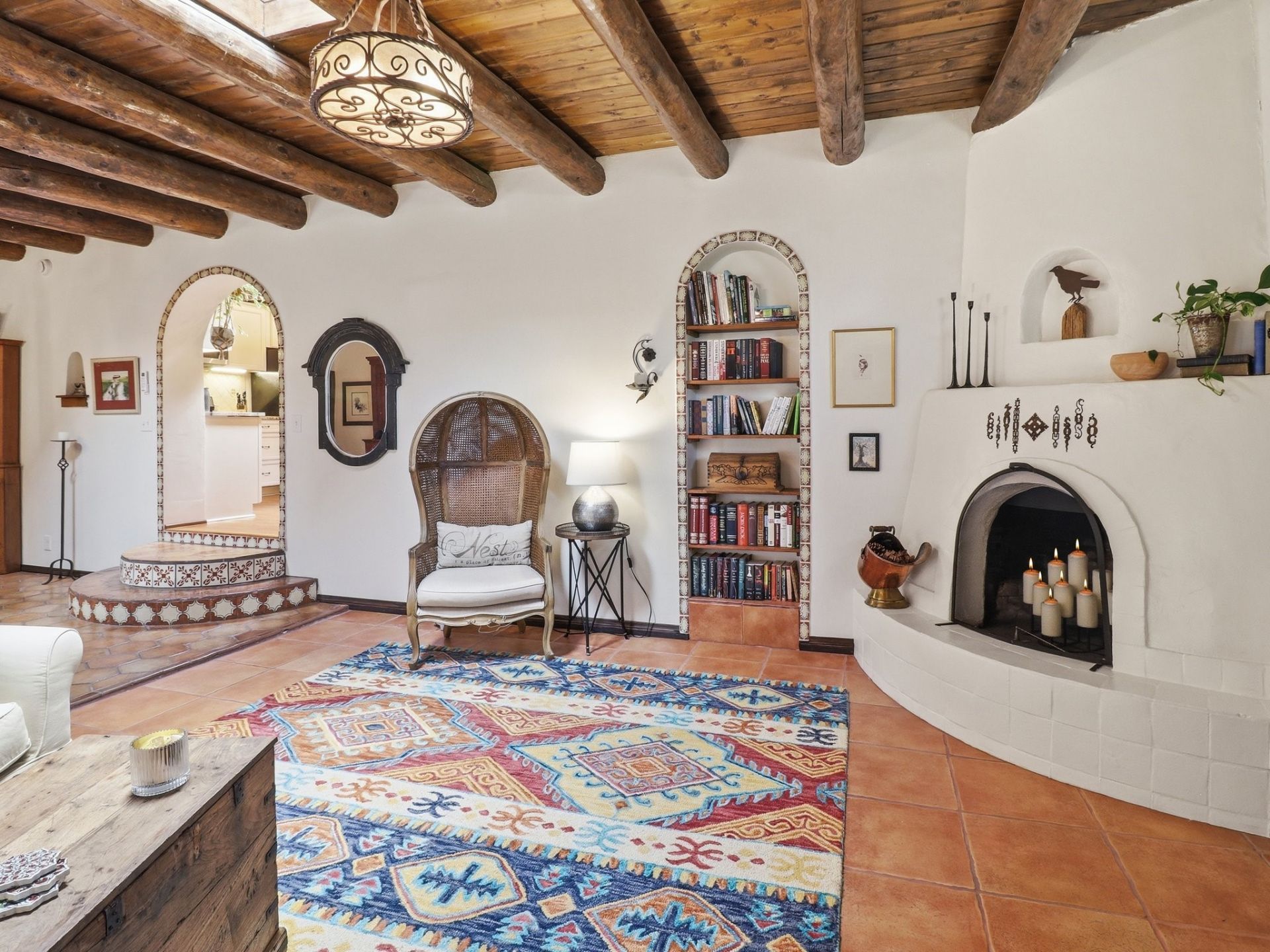 This classic Stamm home is a masterclass in authentic Santa Fe charm, blending historic architectural details with the functional space today's luxury buyers crave. Featuring 4 bedrooms, 3 bathrooms, and a versatile flex room, the residence is defined by traditional vigas that stretch across the ceilings, creating a warm, grounded atmosphere throughout. The interior showcases a rich palette of textures, from original hardwood floors to Saltillo tile and timeless finishes. Distinctive arched doorways accented with Spanish tile lead you through the home, while three wood-burning kiva fireplaces serve as soulful focal points for gathering. Outside, the property transforms into a private desert oasis. The beautifully landscaped grounds are anchored by a covered pergola, perfect for alfresco dining or quiet evenings. Located just minutes from the Santa Fe Rail Trail, this home offers the perfect balance of serene living and active lifestyle access.