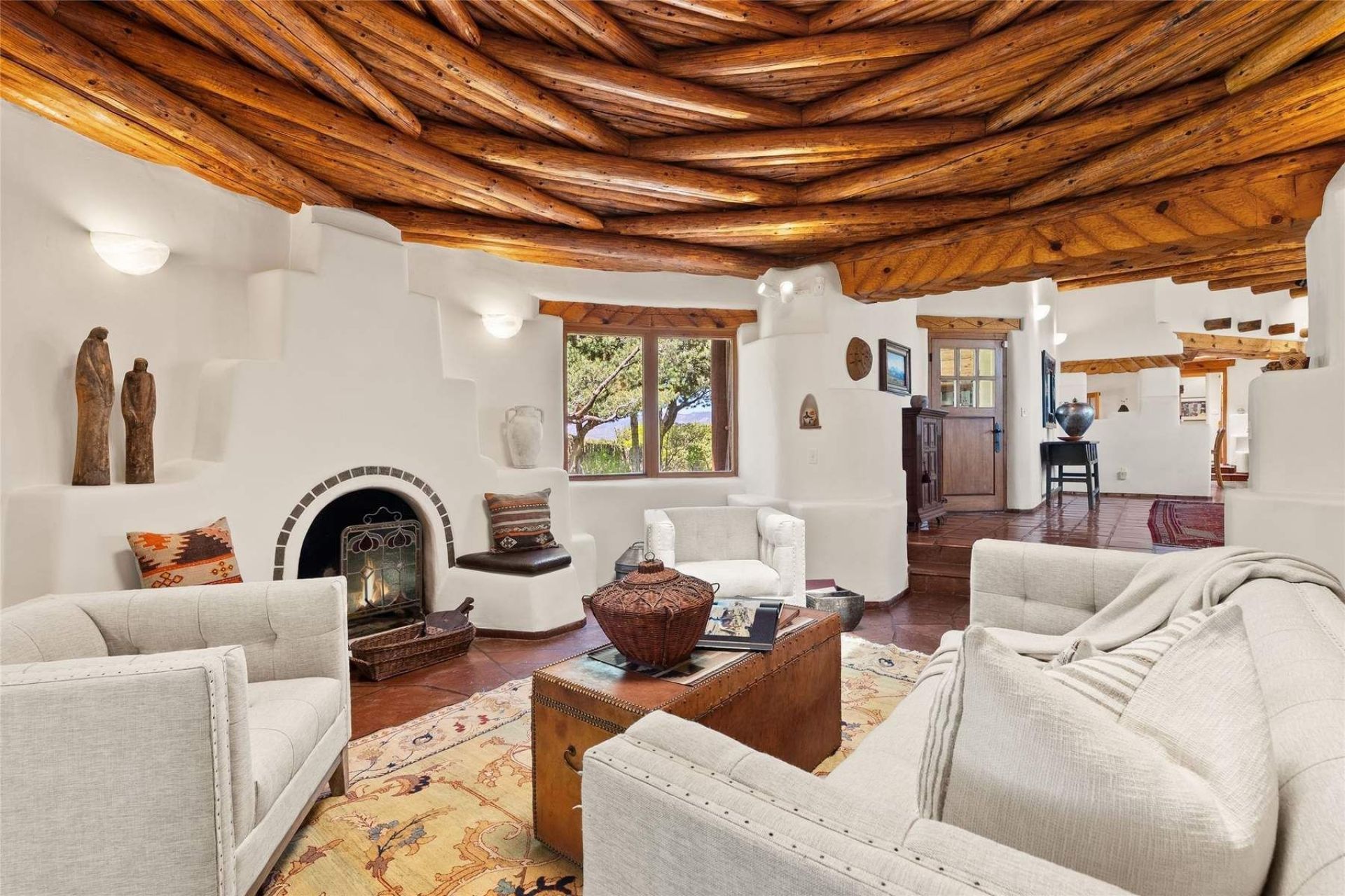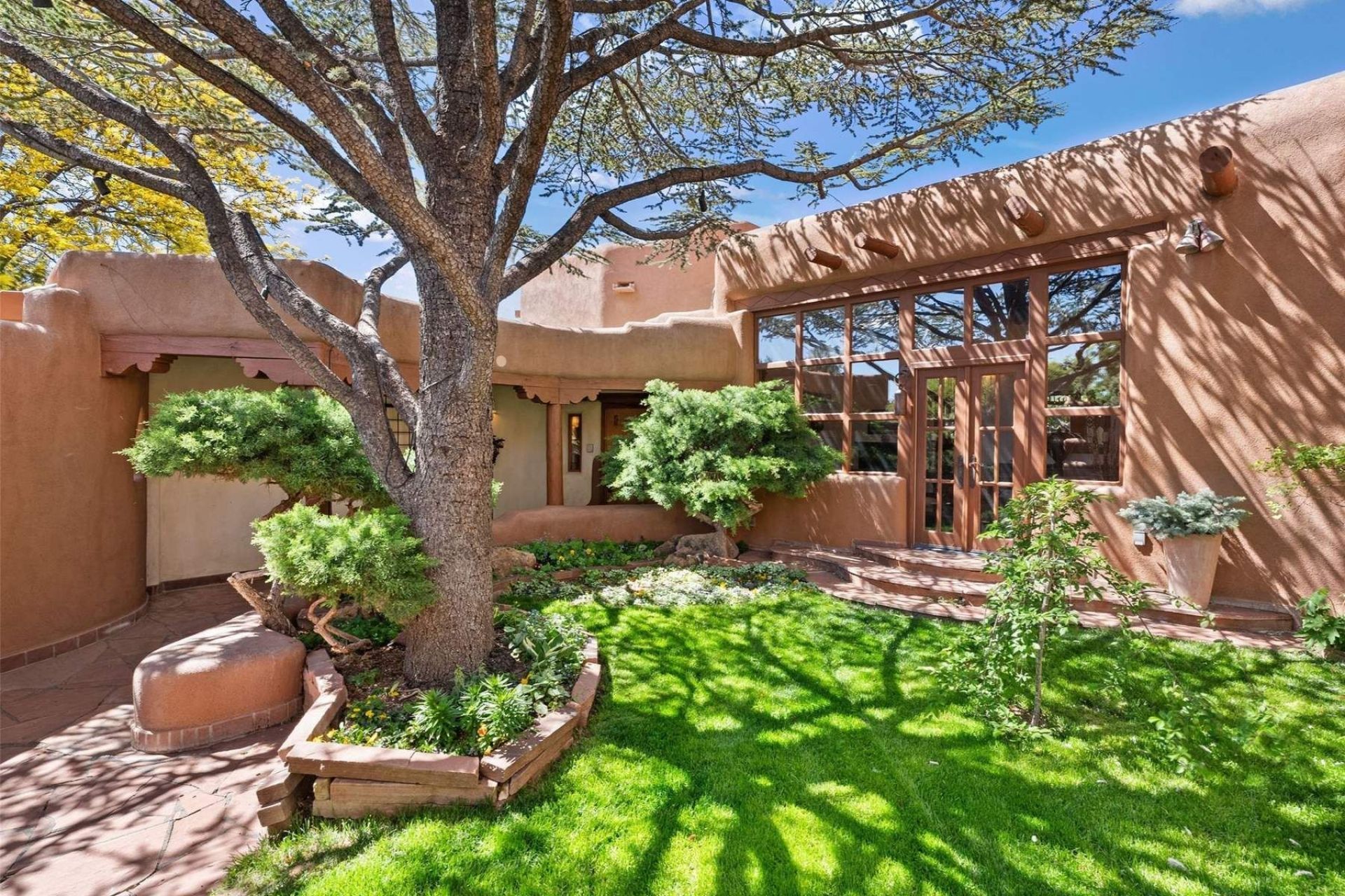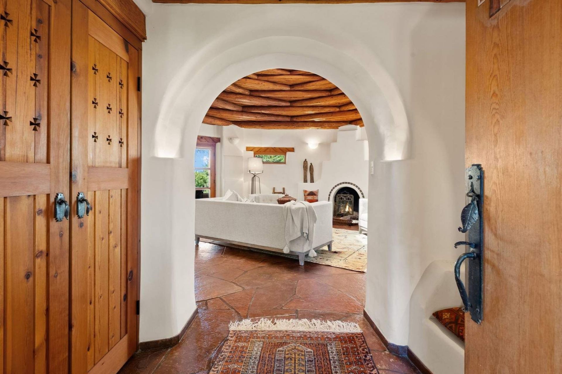 ADOBE ROSE *** Privately situated, this Santa Fe?style estate offers expansive views, layered outdoor spaces and authentic architectural detail throughout. A landscaped courtyard leads into interiors with curved adobe walls, Saltillo tile floors, carved doors and multiple kiva fireplaces. The circular living room with tiered beamed ceiling opens to a west-facing portal and the dining room connects directly to the courtyard. The kitchen flows to a covered portal with built-in grill, cabinetry, dual sinks and seating for entertaining. Upstairs, a bright office with built-ins and powder room opens to a rooftop deck with mountain views, kiva fireplace and additional seating areas. The primary suite includes a fireplace sitting area, private garden with heated wading pool and outdoor shower and a bath with soaking tub and steam shower. Two additional bedrooms, flexible bonus spaces and a separate casita with kitchen and bath provide comfortable accommodations. The grounds feature winding paths, gardens, koi pond and multiple patios. Two-car garage plus detached third garage with studio/workspace.