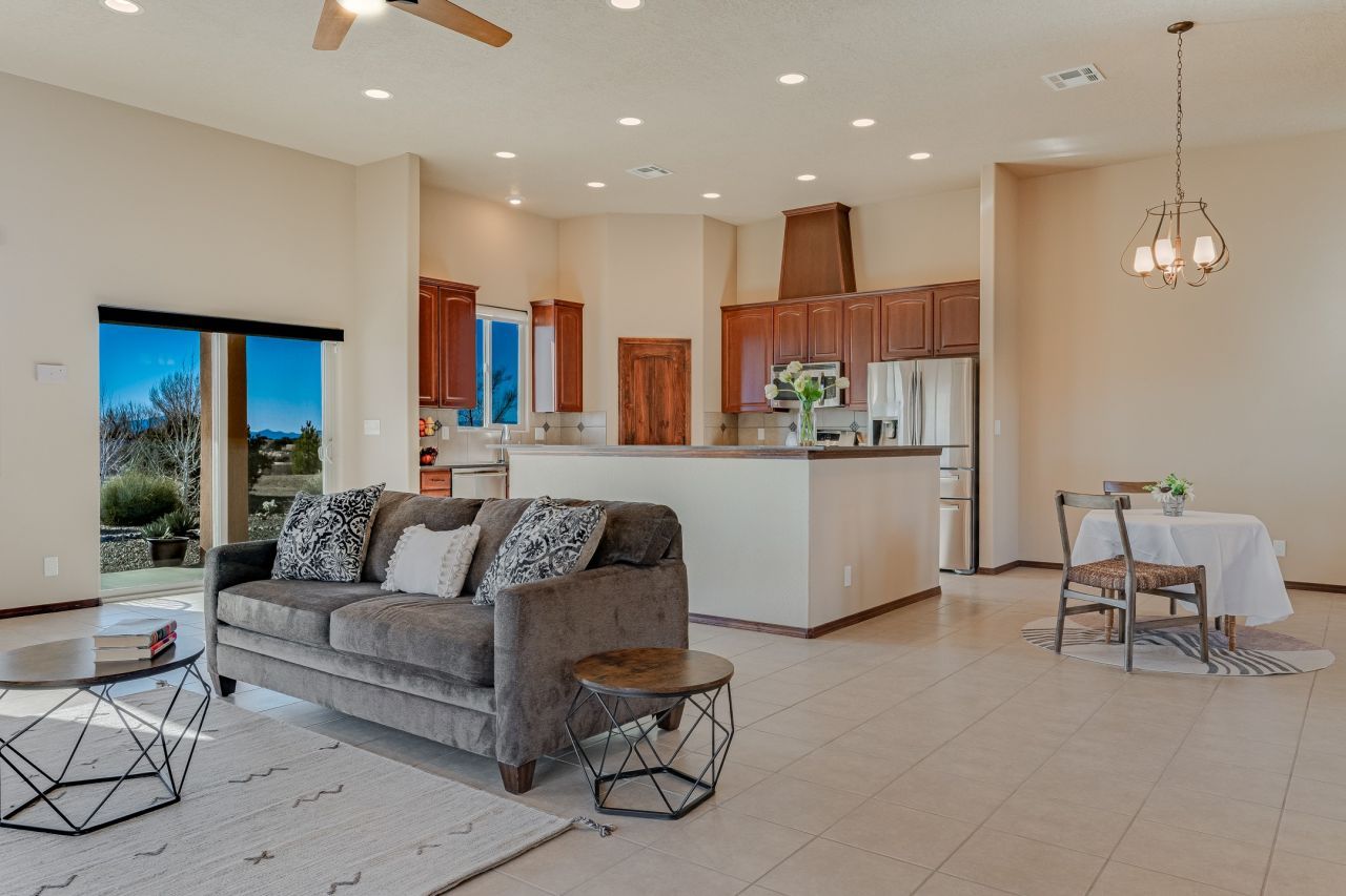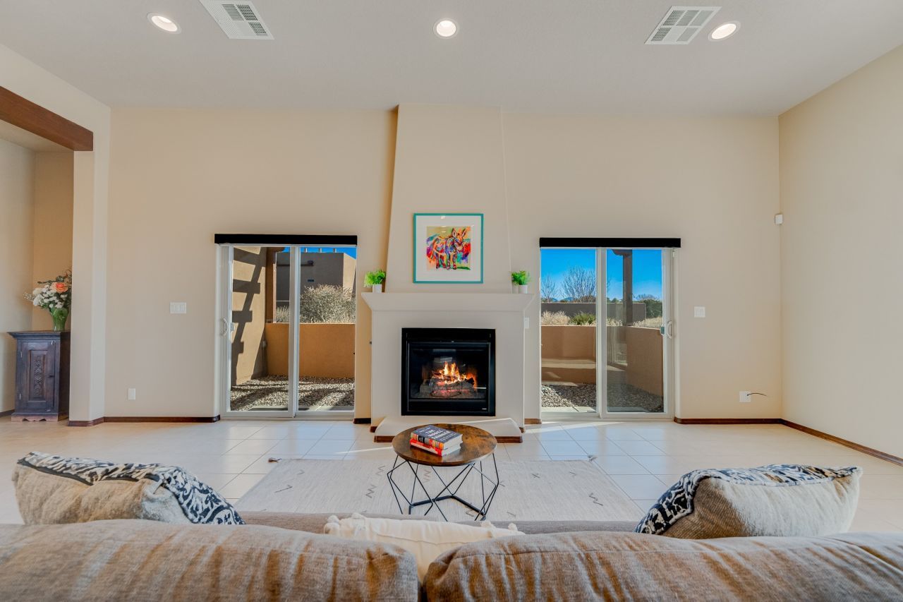 BEST VALUE in La Pradera! This thoughtfully designed three-bedroom, two-bathroom home offers space, comfort, and elegance in a peaceful neighborhood that is both easy to live in and commute from. The single-level home spans +/- 2000 square feet and includes a 200+ sqft attached studio (the converted third garage bay)?ideal as a fourth bedroom, office, or creative space. A bright living room with a cozy fireplace invites relaxation, while the modern kitchen features stainless steel appliances, stone counters, and ample space for cooking and entertaining. High ceilings, recessed lighting, and tile flooring enhance the open layout. The primary bedroom is complemented by an en-suite bathroom with double vanities, soaking tub with separate shower, and a generous walk-in closet. Two additional bedrooms provide flexibility for family or remote work. Located in the back of the development with views of green space and close to walking trails, your private outdoor space will feel limitless. Mature landscaping, the covered back portal and large side pergola combine to offer space for gatherings, gardening, or quiet moments. Other features include an attached 2-car garage, central AC and heat, and a roof with transferable warranty. Located near the Dinosaur Trail Trailhead and close to local supermarkets and healthcare, this home combines practical living with Santa Fe charm.