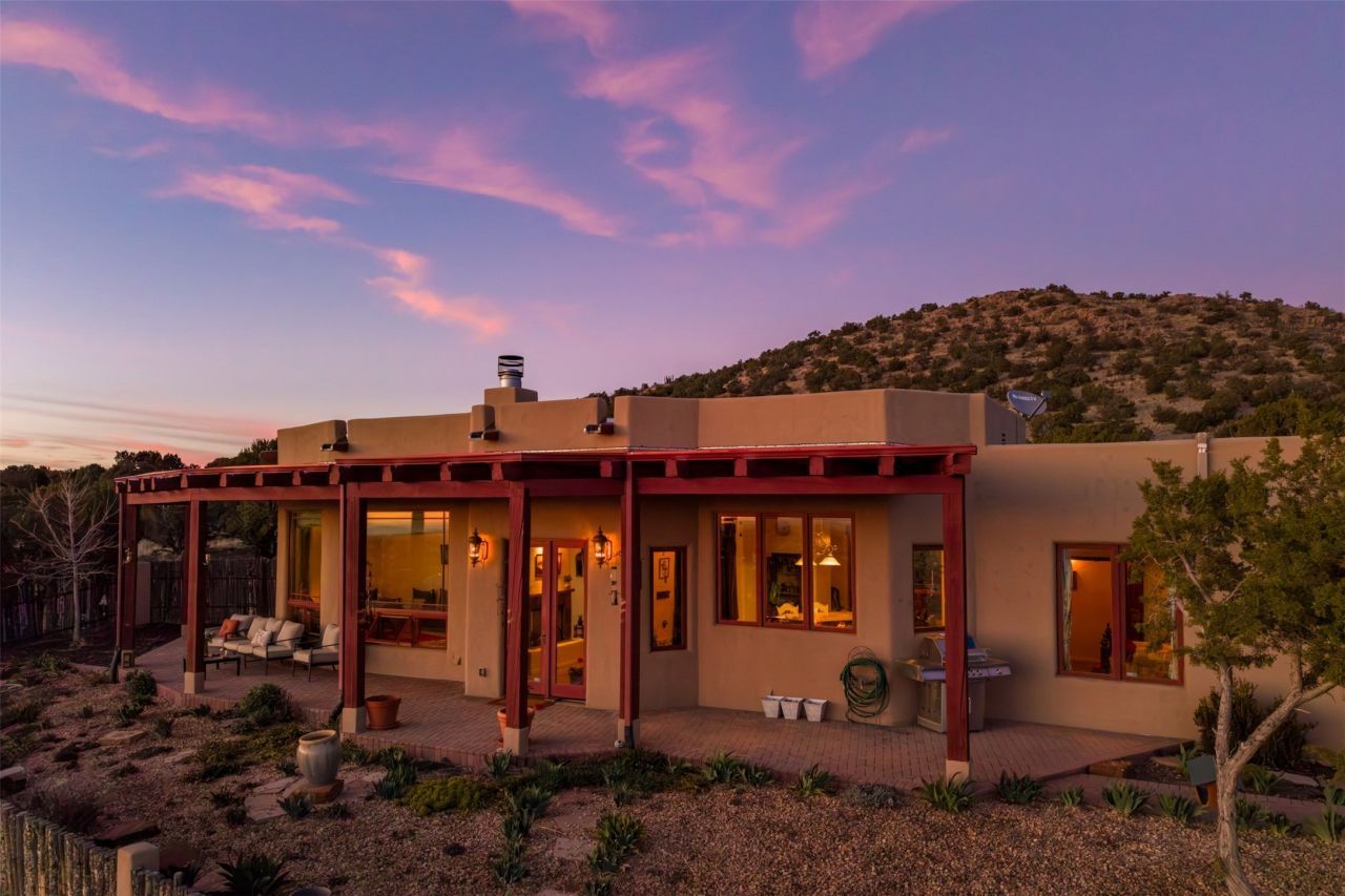 Immaculate and soulful, this single-level residence is beautifully finished with a timeless old-world aesthetic, offering a refined interpretation of Santa Fe living. Featuring 3 bedrooms and 3 baths (one full, one three-quarter, and one half), along with two versatile flex spaces?one is +/- 150 sq. ft, and the other +/- 85 sq. ft. The home is set on a private, expansive 3.93-acre lot and is thoughtfully designed for both comfort and privacy, with a well-conceived floor plan that separates the guest suites and the primary suite into distinct wings. Tucked away on a quiet street in the coveted Los Griegos subdivision?just 20 minutes from downtown Santa Fe?this 2007 Archetypes Homescapes residence is perfectly sited to capture sweeping, unobstructed views. Inside, authentic craftsmanship and rich character define the interiors, with hand-troweled plaster walls, warm tile flooring, and wood-beamed ceilings throughout. Mesquite Mexican doors and custom cabinetry add depth and artistry. The open-concept living space is anchored by a dramatic fireplace, creating an inviting yet sophisticated focal point. The kitchen is both functional and elegant, featuring granite countertops, stainless steel appliances, and a wine refrigerator. The primary suite offers a serene, private retreat with a spacious walk-in closet and a spa-like bath complete with a deep soaking tub. Modern comforts are seamlessly integrated, including radiant floor heating and mini-split cooling systems for year-round climate control. Sustainability is enhanced by a 24-panel photovoltaic solar array and energy-efficient Rastra construction. Outdoors, an expansive wraparound rear portal invites relaxed living and unforgettable sunset views across the surrounding landscape. The fully coyote-fenced backyard provides both privacy and security, completing this exceptional offering that blends timeless elegance with the natural beauty of Northern New Mexico.