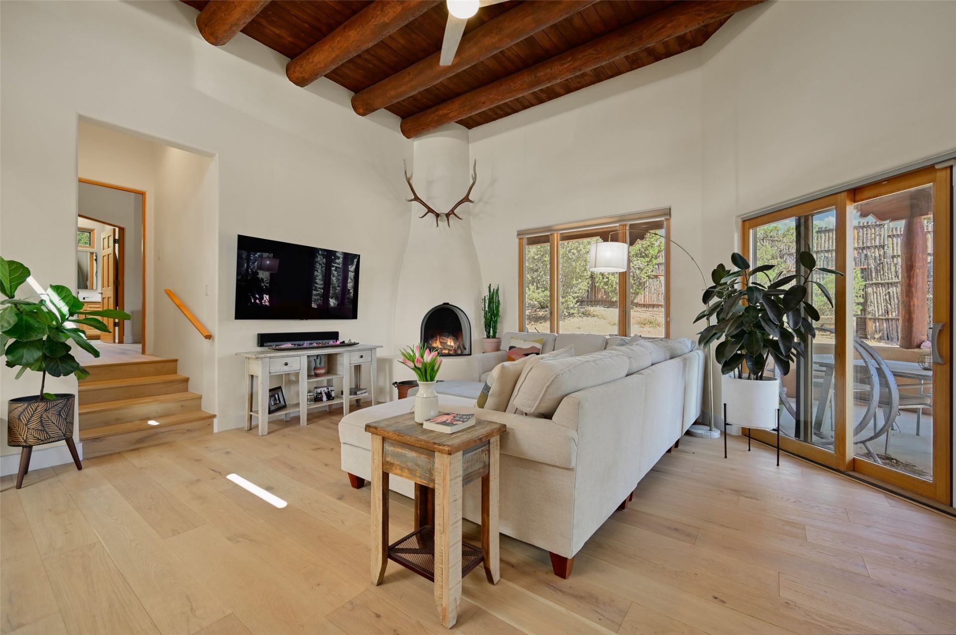 Situated on an oversized in-town lot with ample space to add an ADU, this tastefully renovated home offers the perfect blend of comfort, privacy, and the Santa Fe lifestyle. A gated entry welcomes you into a beautifully fenced property featuring low-maintenance xeriscaping and an abundance of mature trees, creating a serene and private setting. Ideally located on the desirable north side, you're just minutes from De Vargas Center and the historic downtown Plaza, with convenient access to Los Alamos. Enjoy nearby hiking and biking trails, as well as the popular Frank Ortiz and Ridgetop Dog Parks, all just moments from your doorstep. This unique property features stunning mountain views of the Sangre de Cristo Mountains and has been meticulously maintained and thoughtfully upgraded by its current owners?making it truly turnkey. Recent improvements include beautifully remodeled bathrooms, an updated kitchen, wall-to-wall engineered oak flooring, and a Navien tankless water heater with recirculation. A new TPO membrane roof with added insulation was installed in 2023 for enhanced energy efficiency. The home also boasts a fully owned 7.6 kW photovoltaic solar system that covers the property's electrical needs?with surplus capacity to charge your EV using the already installed charger in the spacious two-car garage. 839 Camino Francisca is a rare opportunity to enjoy modern upgrades, sustainability, privacy, and the very best of Santa Fe living.