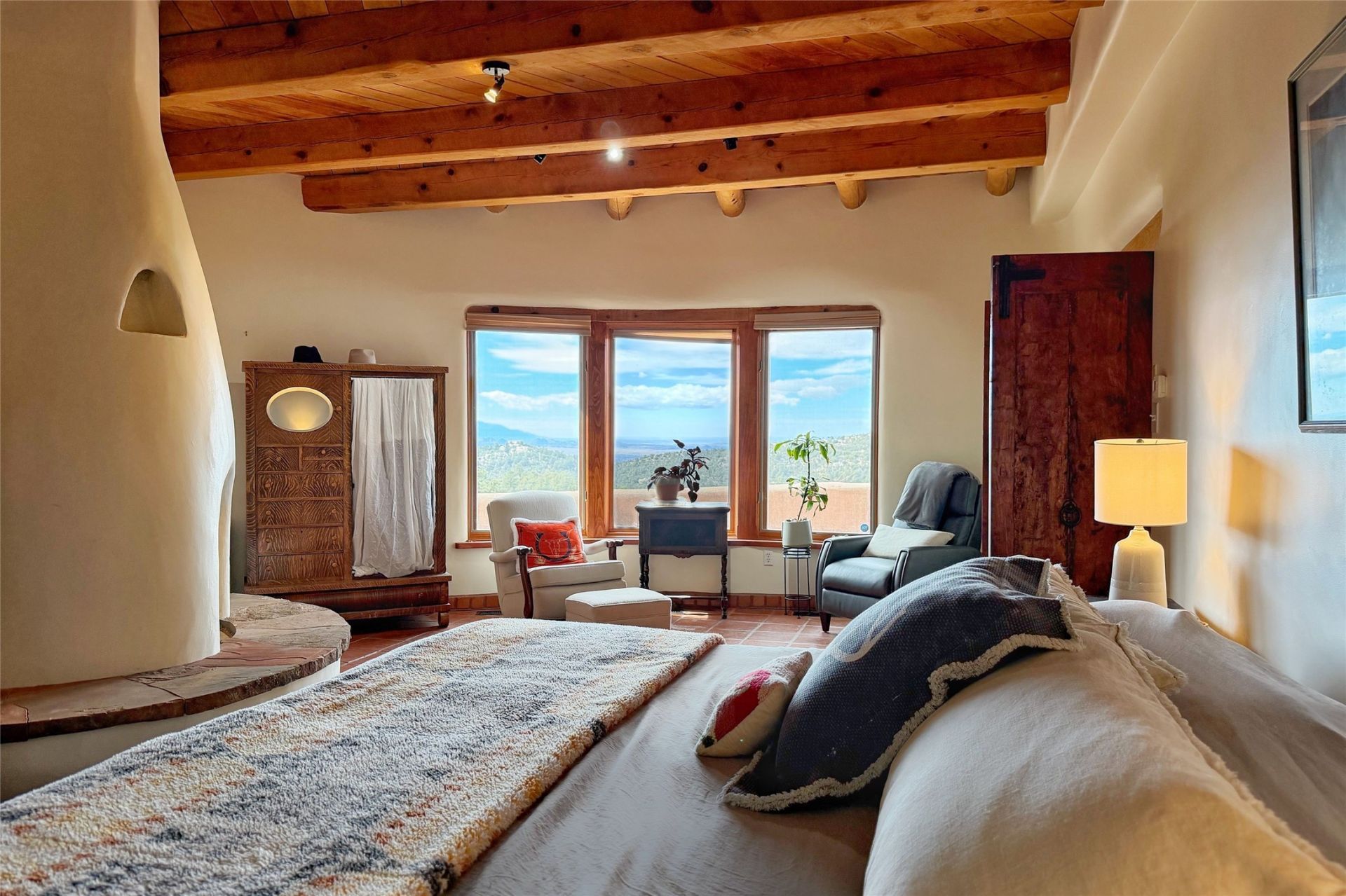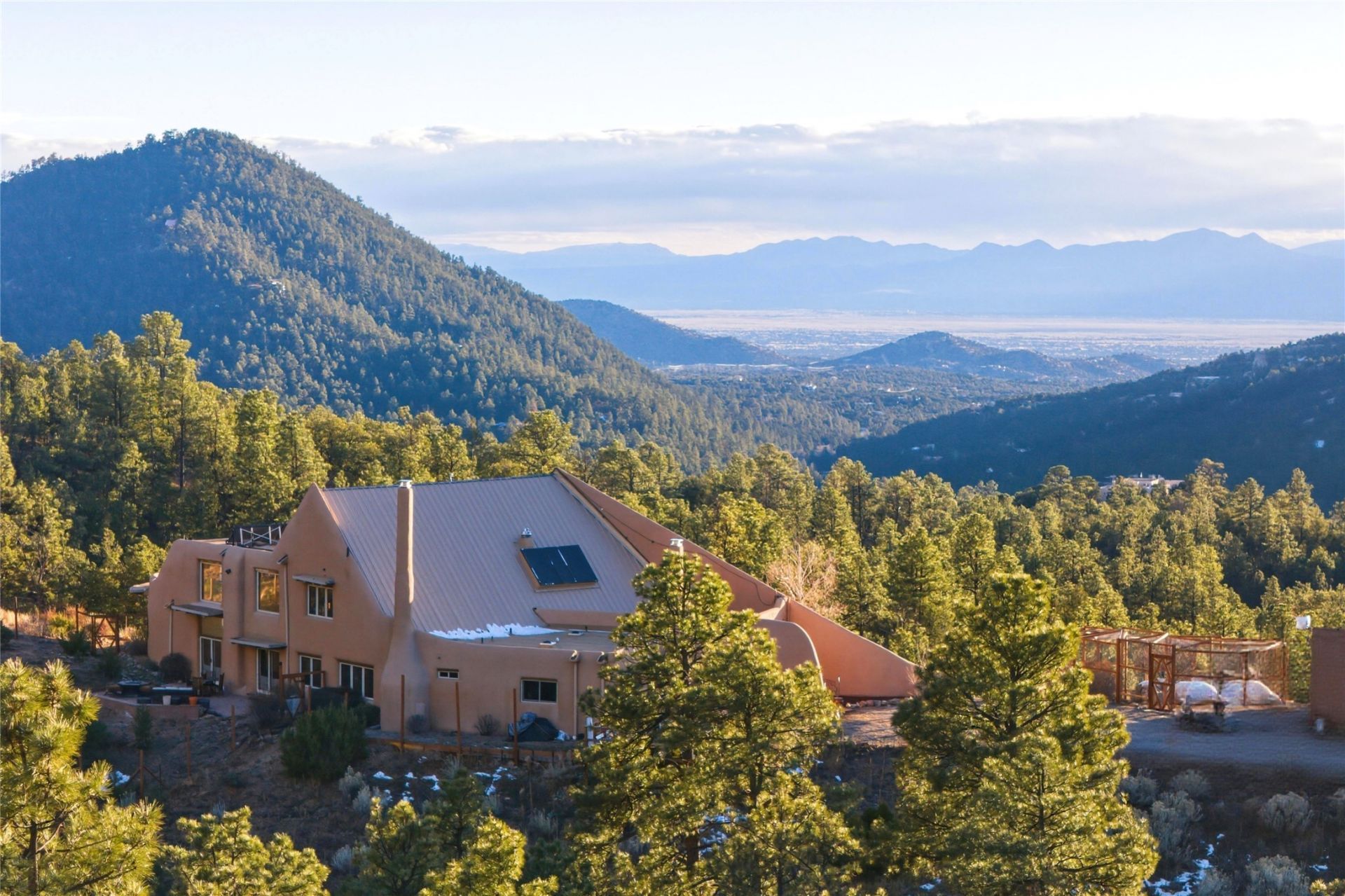 Sited atop a serene, tree-covered hillside, this one-of-kind mountain retreat offers an extraordinary blend of artistry, architecture, and natural beauty. Set on four expansive lots totaling approximately 78.38 acres, the property provides unmatched privacy, tranquility, and breathtaking views from every room. Crafted with timeless adobe construction, the home showcases stunning architectural details throughout, including exquisite hand-carved doors that reflect true craftsmanship and character. Each of the four spacious bedrooms features its own en-suite bathroom, creating a private retreat for residents and guests alike. Surrounded by unspoiled nature, this remarkable property is a haven for outdoor enthusiasts and creatives. Explore endless opportunities for hiking, wildlife watching, and peaceful reflection right outside your door. Evenings bring unforgettable sunsets and some of the brightest star-filled skies imaginable, offering a daily connection to the beauty of the natural world. Enjoy sweeping views of the Sangre de Cristo Mountains while still being conveniently located minutes from shopping/restaurants and just 16 minutes from the Santa Fe Plaza. Whether you're seeking seclusion, inspiration, or a luxurious escape, this exceptional property delivers a rare opportunity to own a true sanctuary in the high desert.